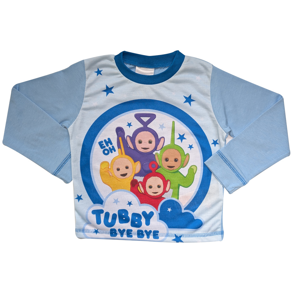 - Top: The long-sleeved top features a cheerful print of the four Teletubbies. A star and cloud background features the text 'EhOh' and 'Tubby Bye Bye'. The light blue body and darker sleeves create a fun contrast.