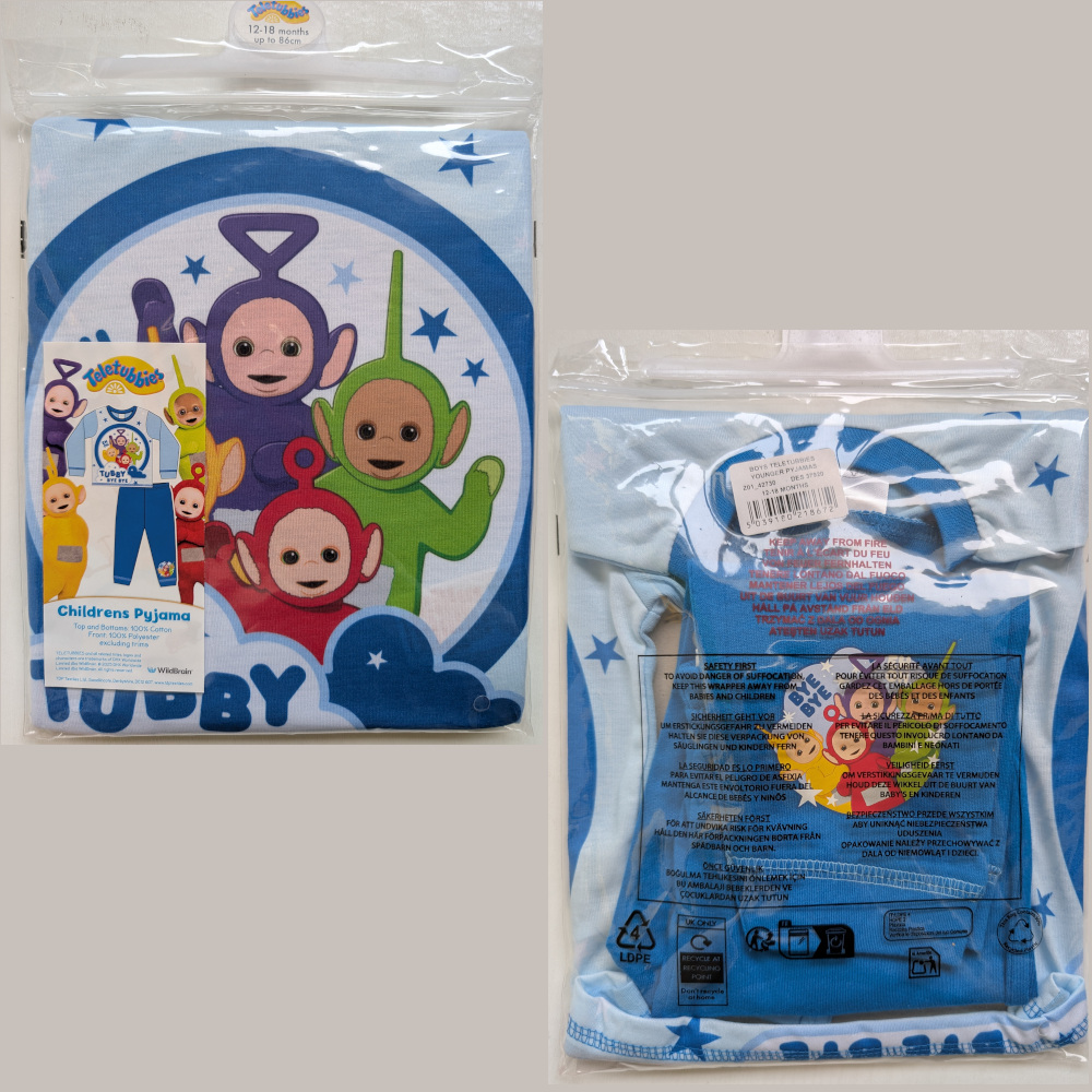 - Bottom: The matching long bottoms in navy feature a further image to the bottom of one leg, of the Teletubbies and the text eh oh and bye bye.