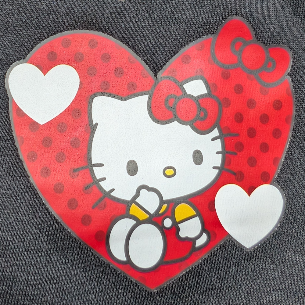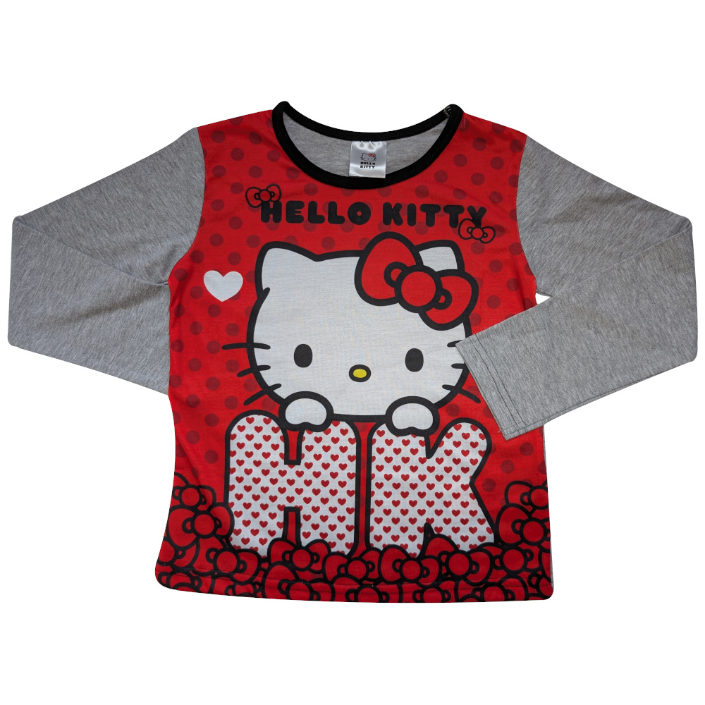 - Top: The long-sleeved top features a red body and grey sleeves with a Hello Kitty bows and hearts design. The front is 100% polyester for a smooth, soft feel and vivid print quality, while the back and sleeves are cotton rich for comfort.