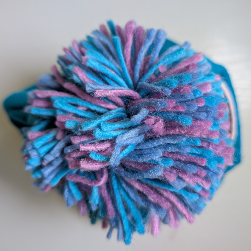 Image 6: Is a close up of the blue, pink and purple bobble to the top of the winter hat.