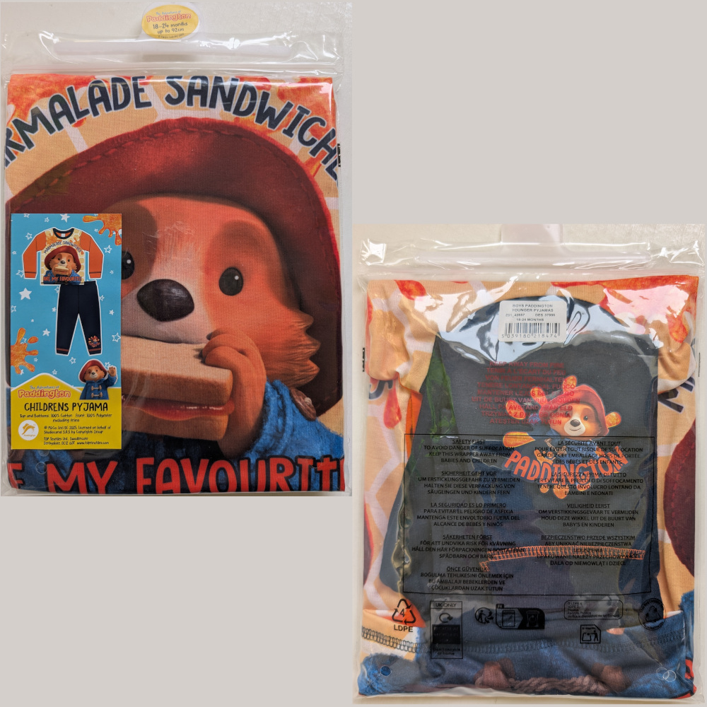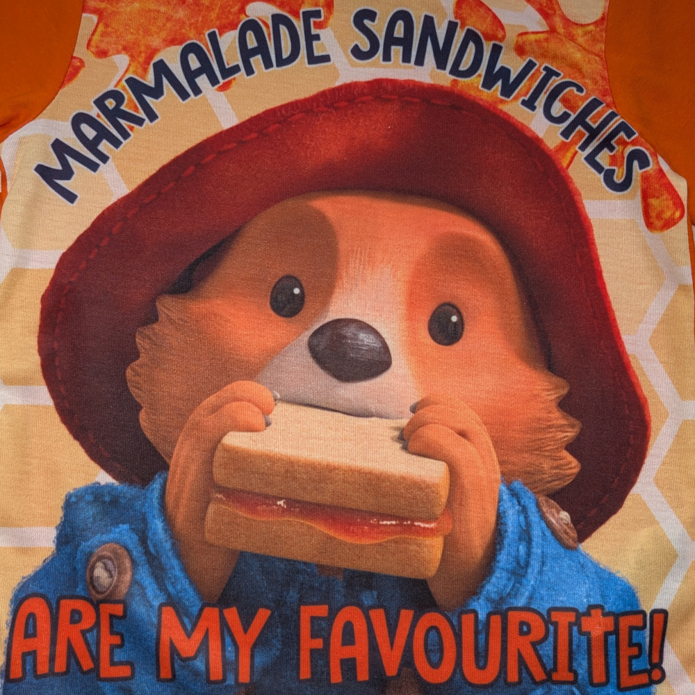 - Top: The long-sleeved top pairs orange sleeves with a blue body,with marmalade splashes and honeycomb design in the background. With the character image showcasing Paddigton in his iconic red hat and blue duffle coat eating one of his famous marmalade sandwiches.