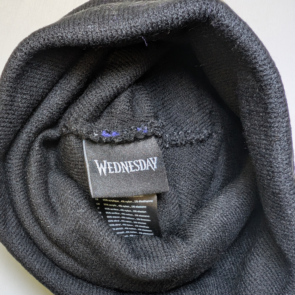 Image 7: Is an image of the Wednesday beanie with the hang tag attached.