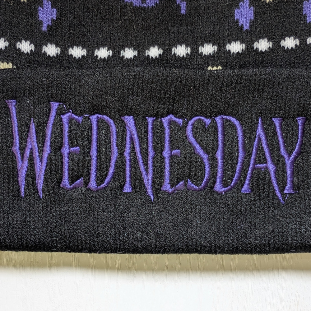 Image 4: Is of the embroidered text 'WENDNESDAY' to the front of the beanie.