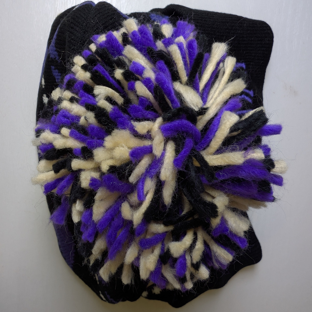 Image 6: Is a close up of the purple, black and cream bobble to the top of the winter hat.