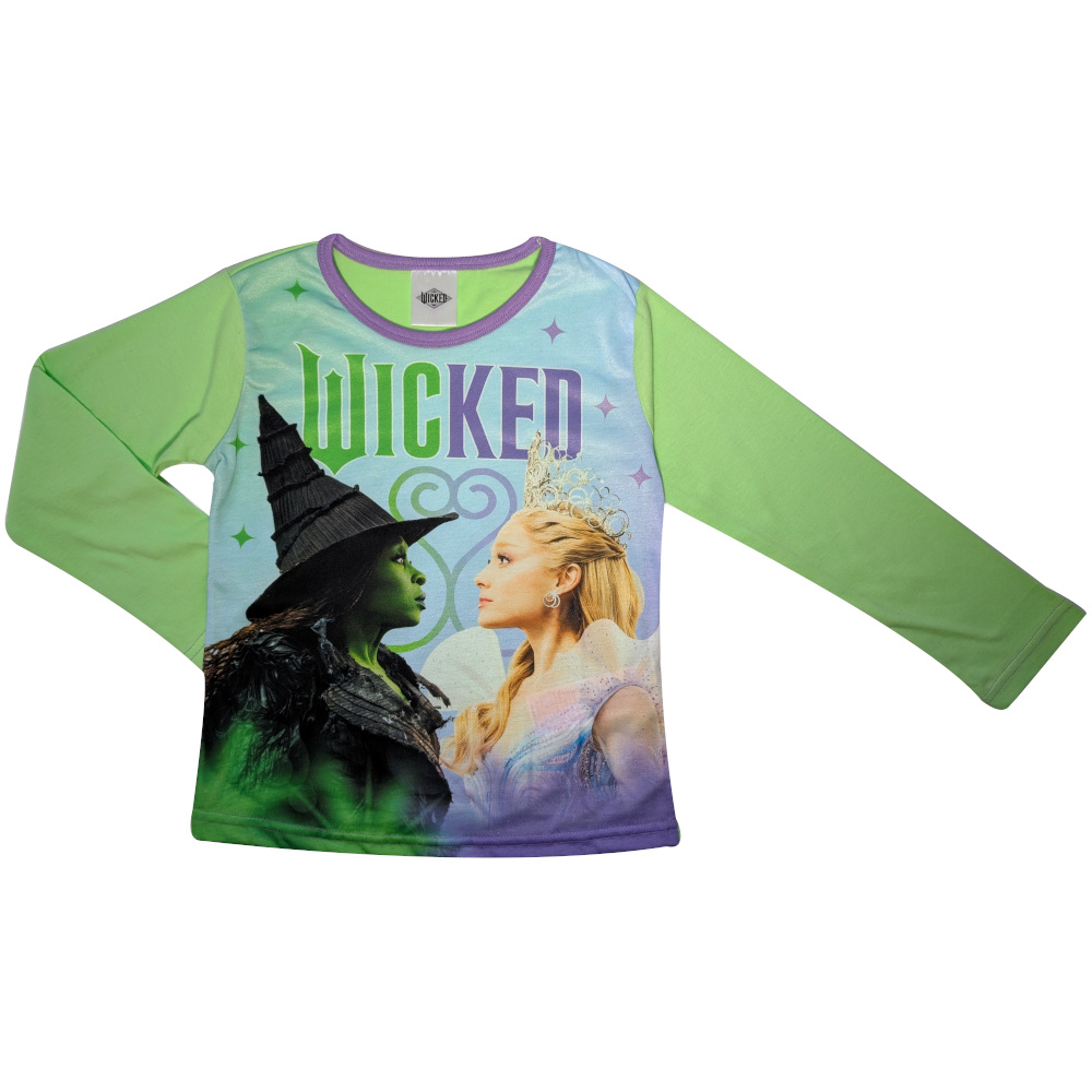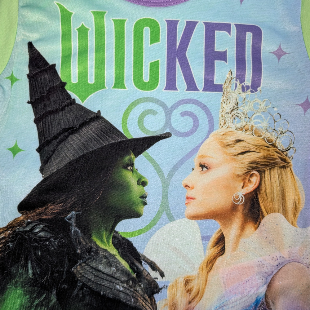 - Top: The long-sleeved top features a Elphaba and Glinda print in lilac and green, with the stars in the background. The text ‘WICKED’ can also be found to the top.