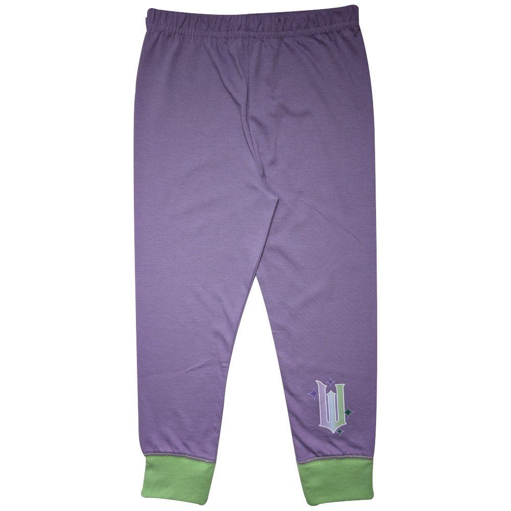Image 1: The long sleeved top and long bottoms of the girls pyjama set in lilac and green featuring a Wicked image to the top and bottom of one leg.